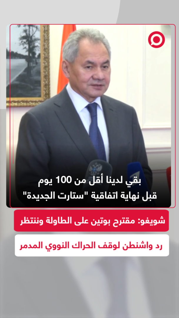 Play/Pause Mute/Unmute شويغو: مقترح بوتين على الطاولة وننتظر رد واشنطن لوقف الحراك النووي المدمر Save post Share Facebook X VK.com Telegram