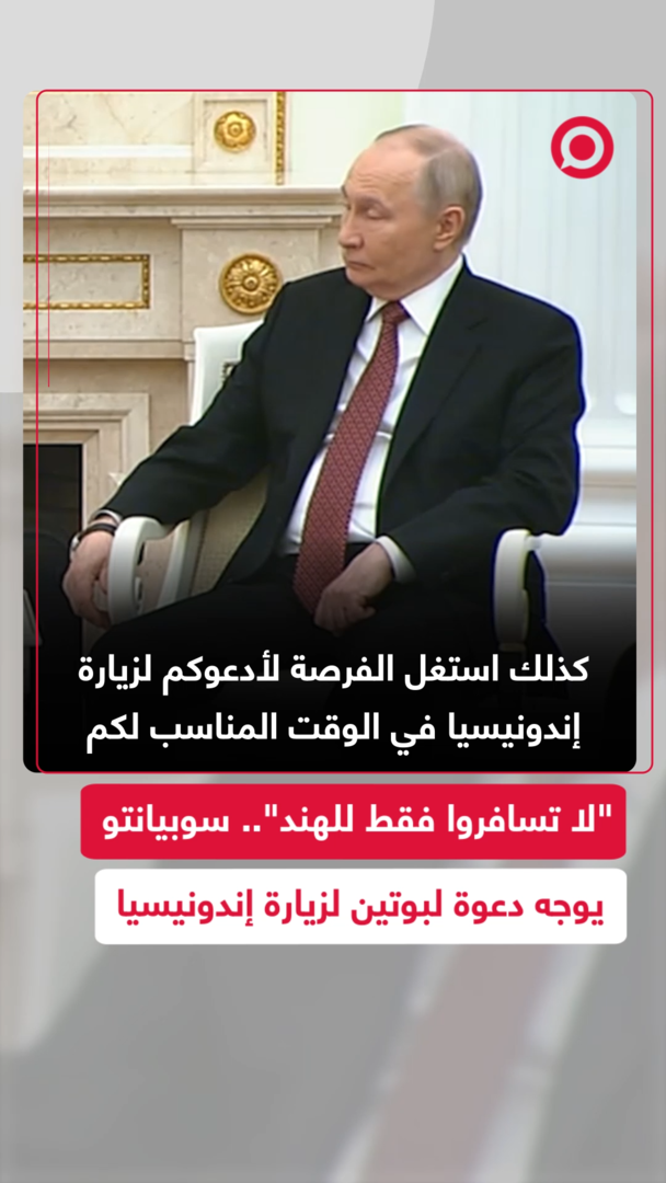 Play/Pause Mute/Unmute "لا تسافروا فقط إلى الهند".. سوبيانتو يوجه دعوة لبوتين لزيارة إندونيسيا Save post Share Facebook X VK.com Telegram